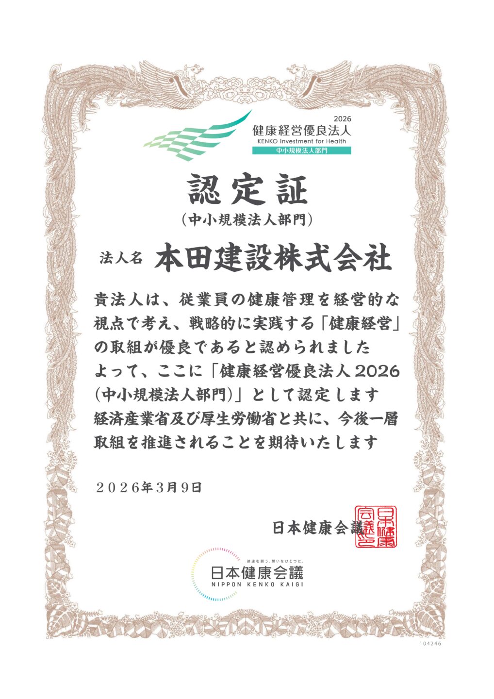 この度、本田建設株式会社は健康経営優良法人2026(中小企業法人部門)に認定されました。